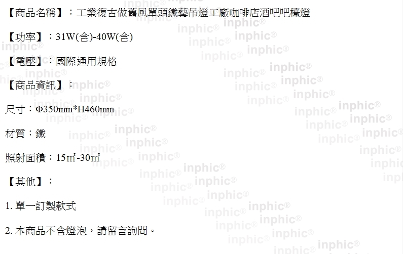 INPHIC-工業復古做舊風單頭鐵藝吊燈工廠咖啡店酒吧吧檯燈_S0197C